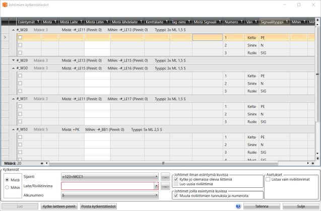 Johtimien kytkentätiedot -dialogi avautuu uuden johtimen määrittelyn jälkeen, mikäli olet valinnut Kytke johtimet luonnin jälkeen -vaihtoehdon. Voit avata dialogin myös Kaapelit-välilehdeltä painamalla hiiren kakkospainiketta haluamasi kaapelin päällä ja valitsemalla Kaapelin kytkentätiedot. Voit valita myös useita kaapeleita kerrallaan pitämällä Shift- tai Ctrl-näppäintä pohjassa.