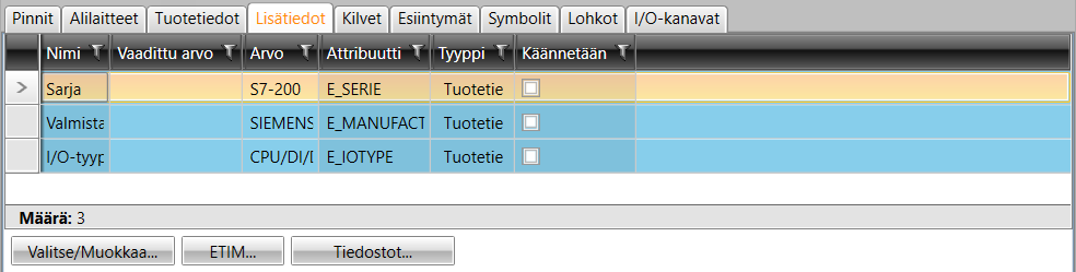 Laitteen ominaisuudet -dialogin Lisätiedot-välilehdellä näytetään laitteelle lisätyt tiedot, esim. kuvaustekstit, asentotekstit ja prosessilisätiedot. Nämä tiedot saadaan näkyviin laitteelle kuviin, ja tietoja voi muokata myös kuvasta käsin.