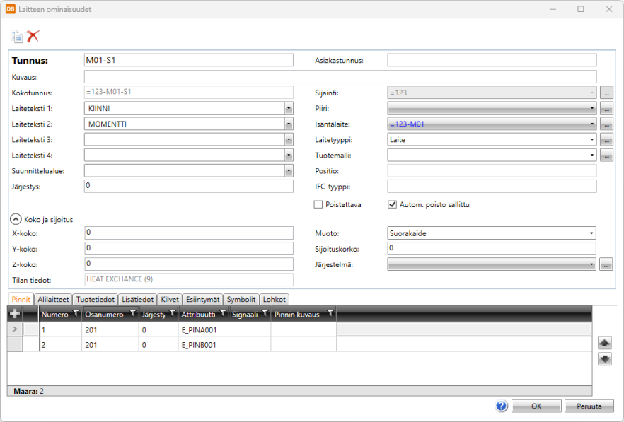 Laiteteksti 1-4 – Kuvassa olevan laitesymbolin attribuutit: E_SYMBTXT1-4. Tekstejä voidaan muokata kuvassa, ja tiedot päivittyvät tietokantaan.