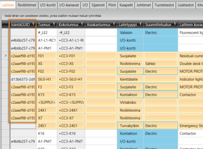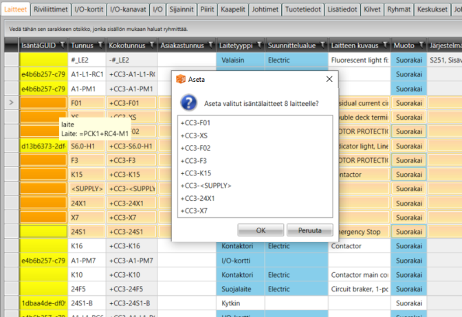 Kun valitset laitteen Electrical DB:n projektipuusta, laitteen ominaisuudet avautuvat Laitteet-välilehdelle. Taustaväriltään valkoisten solujen arvoja voit muokata suoraan gridissä.