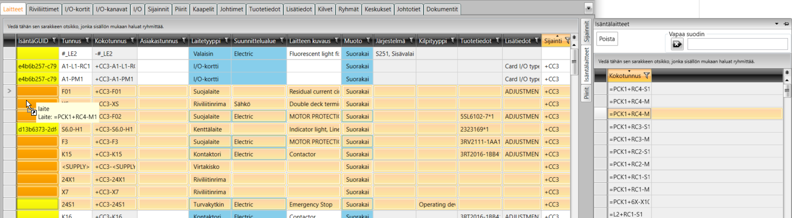 Laitteet-välilehden oikeassa reunassa on kolme apugridiä: Piirit, Isäntälaitteet ja Sijainnit. Saat helposti määriteltyä laitteiden tietoja massana vetämällä tiedot apugrideistä päägridiin.