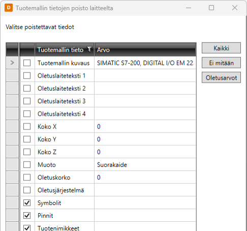 Tuotemalli – Jos laitteelle on määritelty tuotemalli, se näkyy tässä. Tuotemallin saa poistettua laitteelta valitsemalla tyhjän valinnan alasvetovalikosta. Tuotemallin tietojen poisto laitteelta -dialogi avautuu ja voit valita laitteelta poistettavat tiedot.