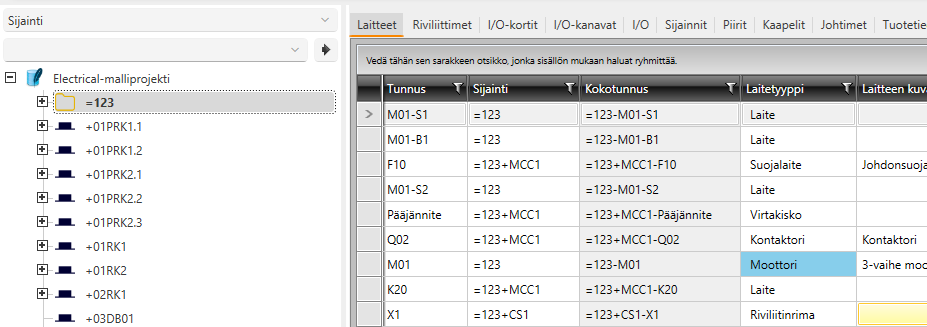 Laitteet-välilehdellä näkyvät projektin laitteet ryhmiteltynä esim. projektipuusta valitun sijainnin mukaan.