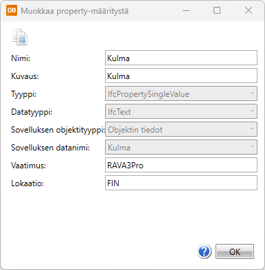 Muokkaa – Muokkaa valitsemasi property-määrityksen ominaisuuksia. Muutokset tallentuvat vain projektissa olevaan property-määritykseen.