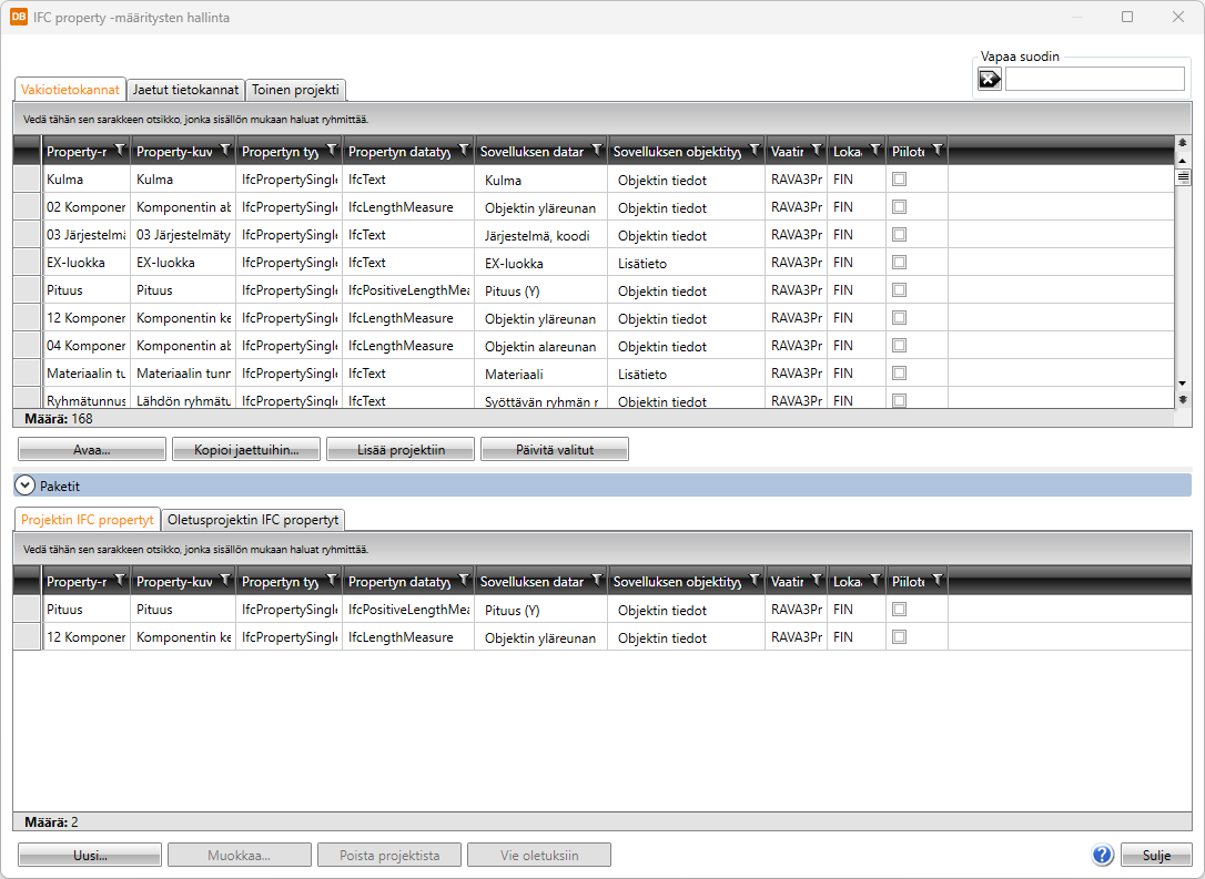 Dialogin alaosassa näytetään projektissa tällä hetkellä olevat property-määritykset ja kaikille projekteille yhteiset property-määritykset.