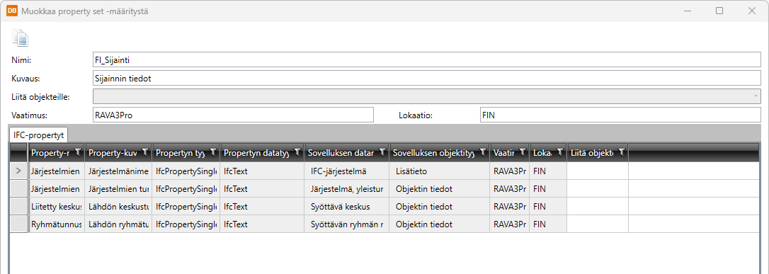 Voit määritellä property setiin niin monta propertyä kuin on tarpeen. Property setillä itsellään ei ole paljoa tietoa: nimi sekä siihen liittyvät propertyt, jotka vaaditaan IFC-vientiä varten. Lisäksi voit valita, mille IFC-tyypeille property set liitetään tai tehdä property-kohtaiset määritykset IFC propertyt -aligridissä. RAVA3Pro-viennissä näiden on oltava tyhjät.
