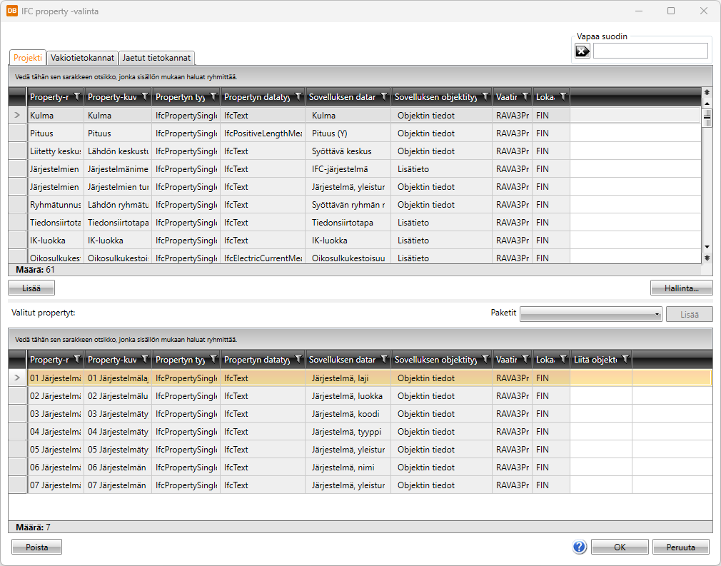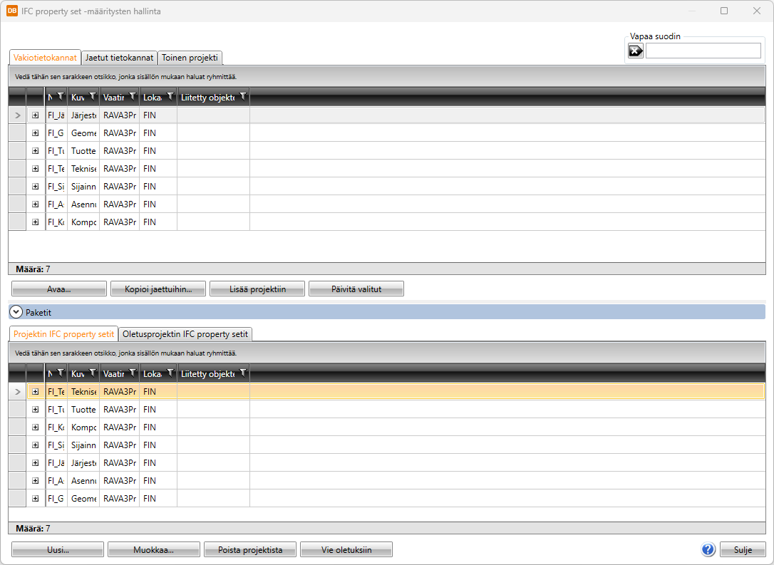 Dialogin alaosassa näytetään projektissa tällä hetkellä olevat property set -määritykset ja kaikille projekteille yhteiset property set -määritykset.