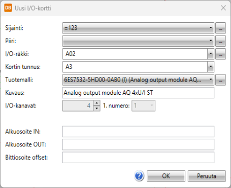 Kortti saa automaattisesti tuotemallin kuvauksen ja kanavatiedot. Lisäksi Alkuosoite IN-, Alkuosoite OUT- ja Bittiosoite offset -kentät tulevat näkyviin.
