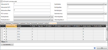 I/O-kortin ominaisuudet -osiosta löytyy vain I/O-kortille ominaisia tietoja. Kun kortille antaa Alkuosoite IN- tai Alkuosoite OUT -tiedon, kortin kanaville syntyy automaattisesti osoitteet.