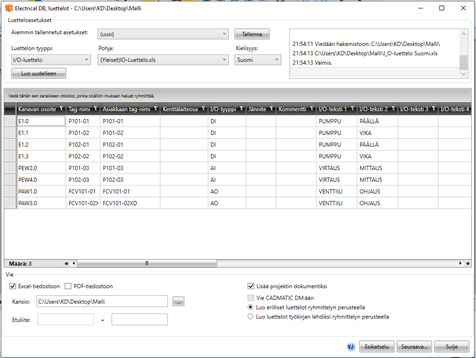 Kun I/O:t on luotu, voidaan niistä tehdä Excel-raportti.