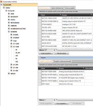 Lisää projektissa käytettävät I/O-korttituotemallit projektille valitsemalla haluamasi tuotemallit vakiotietokannasta ja napsauttamalla sitten Lisää projektiin -painiketta.