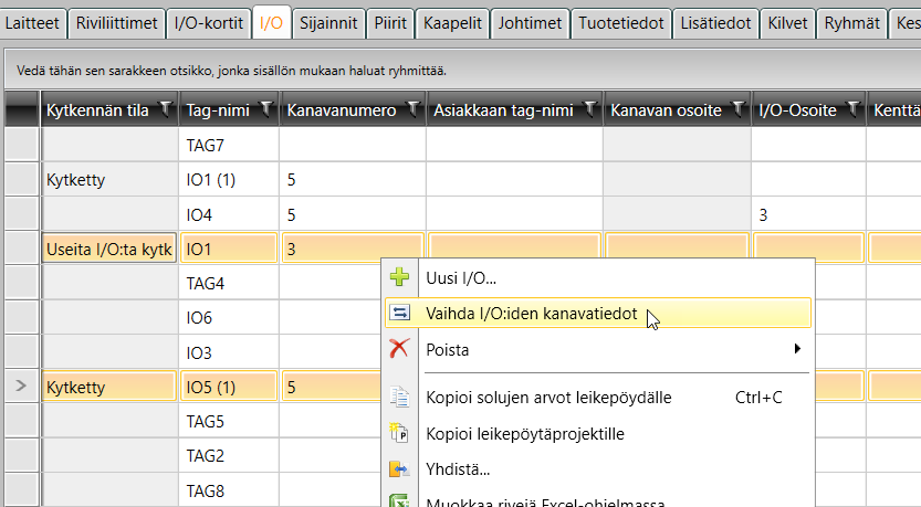 Napsauta hiiren kakkospainikkeella ja valitse Vaihda I/O:iden kanavatiedot.