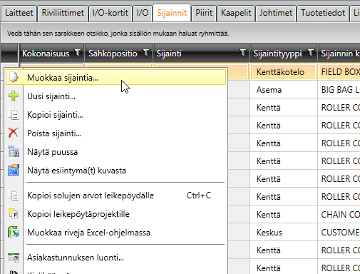 Valitse Electrical DB:ssä Sijainnit-välilehti, valitse haluamasi rivi, napsauta riviä hiiren kakkospainikkeella ja valitse Muokkaa sijaintia:
