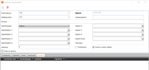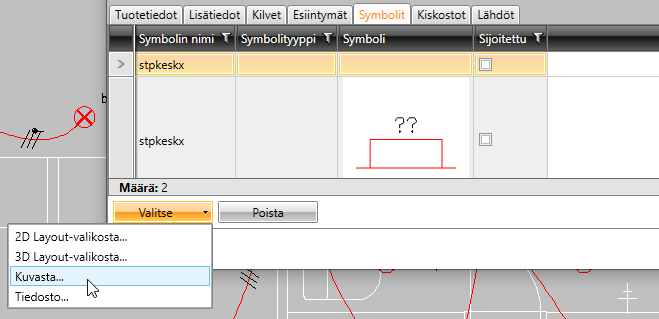 Symbolit-välilehdeltä näet kaikki sijainnin symbolit. Kun avaat ominaisuusikkunan Electrical-projektipuun tai kuvan kautta ja sijainnin tyyppi on Keskus, voit myös valita symboleita Valitse-painikkeella: