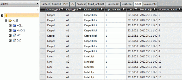 Kilvet-välilehdellä voit muokata ja selata kaikkia projektin kilpiä ja niihin liittyvää tietoa.