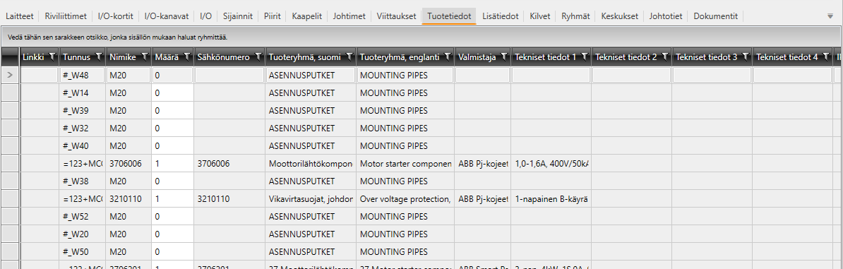 Tuotetiedot-välilehdellä näkyvät kaikki projektin tuotetiedot sekä mille laitteille ko. tuotetietoja on määritetty. Napsauta haluamaasi riviä tai solua hiiren kakkospainikkeella nähdäksesi käytettävissä olevat toiminnot.