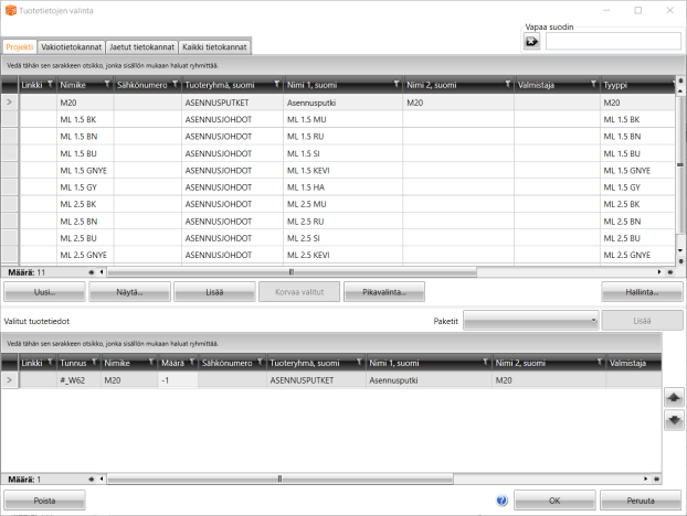 Projekti – Välilehdellä näkyy ainoastaan nykyisessä projektissa käytössä olevat tuotetiedot.