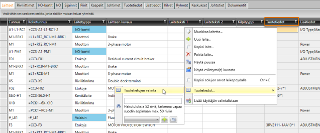 Voit lisätä tuotetietoja nopeasti laitteille, riviliittimille ja sijainneille.