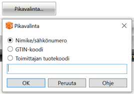 Pikavalinta – Valitse tuotetiedot tuotteen nimikkeen, sähkönumeron, GTIN-koodin tai valmistajan koodin mukaan. Voit syöttää kenttään useita koodeja pilkulla erotettuina tai liittää esimerkiksi leikepöydän kautta listan lisättävistä tuotetiedoista.