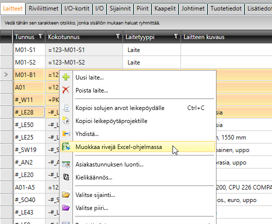Muokkaa rivejä Excel-ohjelmassa -toiminnolla voit viedä projektin tietoja Excel-tiedostoon, muokata tietoja ja tuoda muuttuneet tiedot Electrical DB Työkaluun.