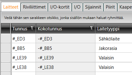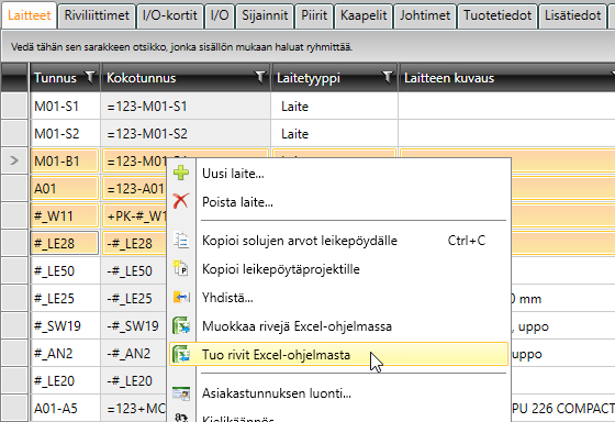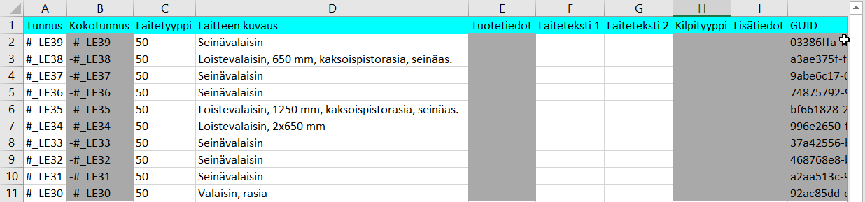 Voit muokata Excelissä sarakkeita, joiden taustaväri Electrical DB Työkalussa on valkoinen. Harmaa taustaväri tarkoittaa, että kyseessä on "vain luku" -tieto, jota ei voi muokata Excelissä. Esimerkiksi Kokotunnus-sarake on tällainen: