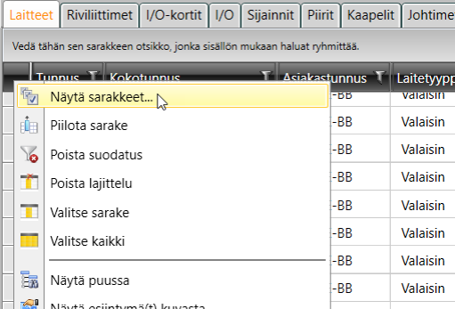 Paina hiiren kakkospainiketta sarakeotsikoiden päällä, ja valitse Näytä sarakkeet.