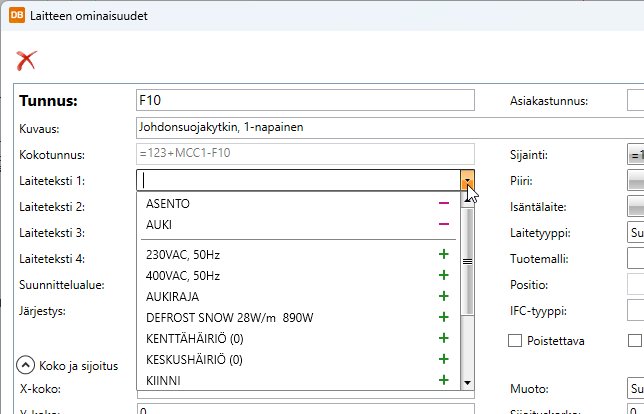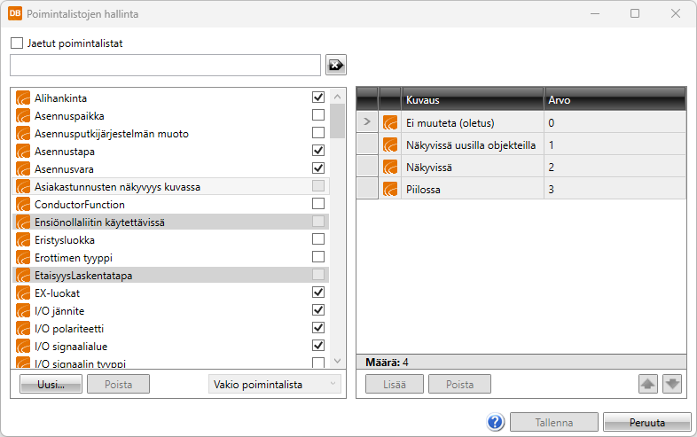 Vakioarvoja voidaan lisätä tai poistaa suoraan muokkaustoimintojen alasvetovalikoissa olevien plus (+) ja miinus (-) painikkeiden avulla tai DB Työkalun asetuksista löytyvällä Poimintalistojen hallinta -työkalulla. Joissain poimintalistoissa on myös esimääriteltyjä vakioarvoja, kuten esimerkiksi IP-luokat.