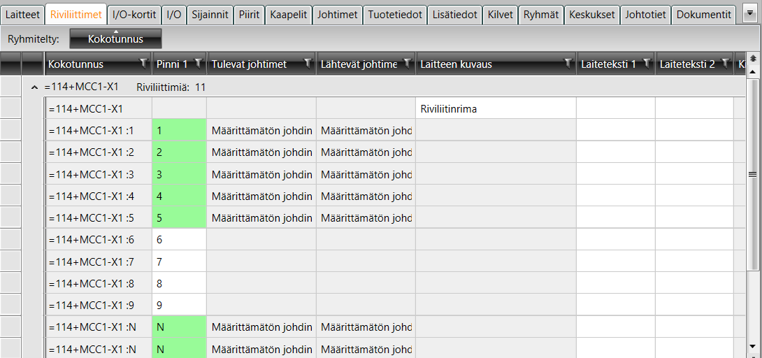 Riviliittimet-välilehdellä näkyvät projektin riviliitinrimat riviliittimineen. Rimat on oletusarvoisesti ryhmitelty kokotunnuksen mukaan. Voit halutessasi poistaa ryhmittelyn tai vaihtaa sen toiseksi (katso Ryhmittele ja järjestä tietoja).