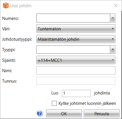 Jos haluat luoda useita johtimpia samalla kertaa, valitse Luo _ johdinta ja määrittele, kuinka monta johdinta haluat luoda. Kaikille johtimille tulee samat tiedot numeroa lukuun ottamatta. Numero generoidaan juoksevana, esimerkiksi 1...5 tai tekstiosalla A1... A5.