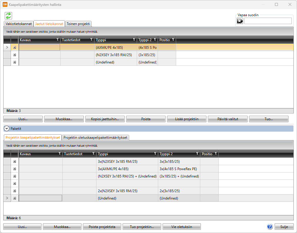 DB-työkalu > Hallinta-välilehti > Kaapelipaketit |