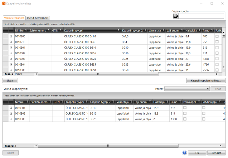 - Valitse kaapelipakettiin kuuluvat kaapelityypit kaksoisnapsauttamalla niitä ylemmässä osiossa tai valitsemalla haluamasi rivit ja napsauttamalla Lisää-painiketta.