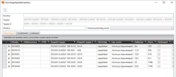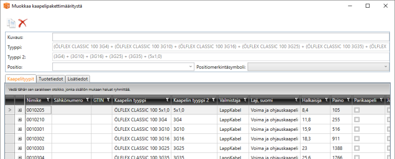 Kaapelipakettien avulla voidaan yhdistää useita kaapeleita kulkemaan samassa johdotuksessa. Kaapelipakettiin määritellään siinä kulkevat kaapelityypit sekä tarvittaessa myös tuotetiedot ja lisätiedot.