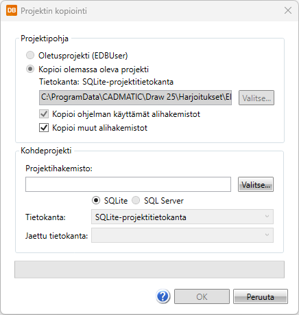 SQLite – Projekti luodaan EDBProject.sqlite-tietokantaan. Jos valitsit kopioitavaksi MDB-projektin, voit muuntaa sen SQLite-formaattiin valitsemalla tämän vaihtoehdon.