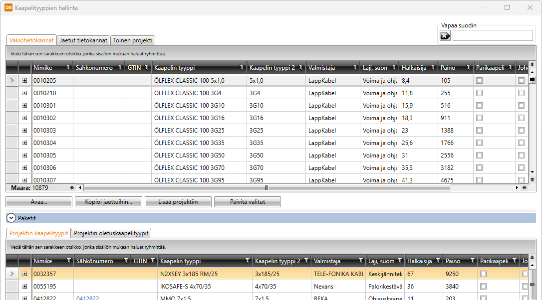 Toinen projekti -välilehdellä voi tuoda tietoja toisesta projektitietokannasta (EDBProject.sqlite tai EDBProject.mdb). Valittuja rivejä voi myös siirtää helposti jaettuihin tietokantoihin painamalla hiiren kakkospainiketta ja valitsemalla Lisää jaettuihin.