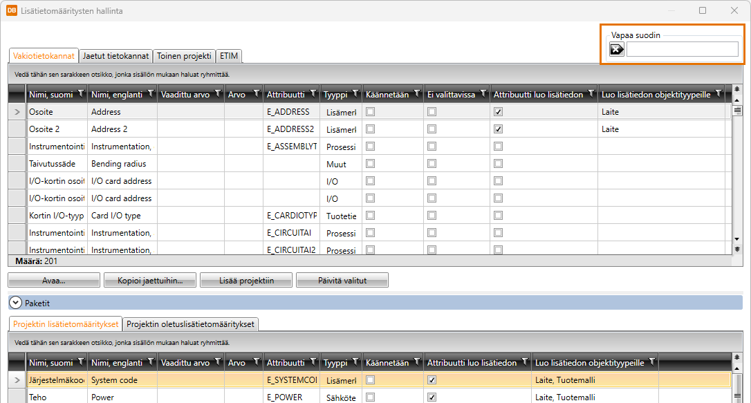 Kaikissa hallintatyökaluissa voi käyttää vapaata suodinta. Vapaalla suotimella voidaan hakea tietoa vapaasti määritetyllä kriteerillä huomioimatta jokerimerkkejä * ja ?.