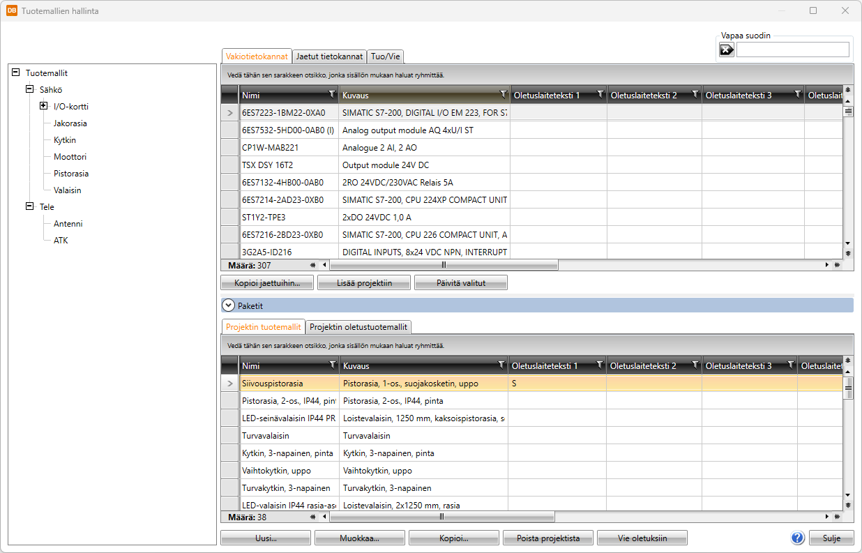 Vakiotietokannat-välilehti sisältää ohjelman mukana tulevat oletustuotemallit, jotka päivittyvät ohjelman päivityksen yhteydessä. Voit kopioida täältä tuotemalleja omiin jaettuihin tietokantoihisi.
