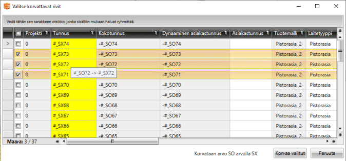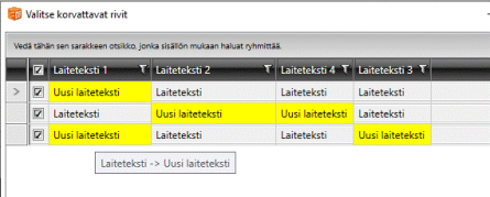 Valitse muokattavat rivit, ja tee korvaus napsauttamalla Korvaa valitut -painiketta.