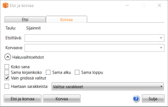 Nämä toiminnot laajentavat Aloitus-välilehden hakukentän ominaisuuksia. Toiminnoilla voit kohdistaa hakua tai korvausta suppeammalle alueelle tarkemmilla kriteereillä.