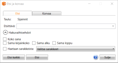 Etsi-välilehden Etsi kaikki etsii hakuehtoihin osuvat rivit ja suodattaa näkyviin vain ne, kun taas Etsi-painike etsii seuraavan arvon, joka osuu hakuehtoihin.