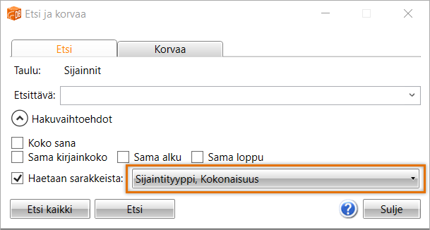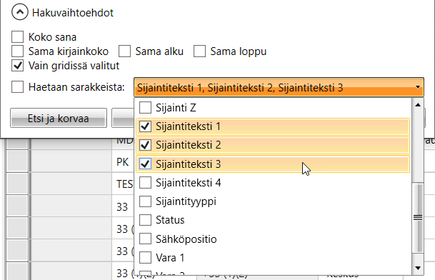 Vaihtoehtoisesti voit valita sarakkeet jo etukäteen, jolloin sarakkeet näkyvät valittuina, kun avaat hakutoiminnon: