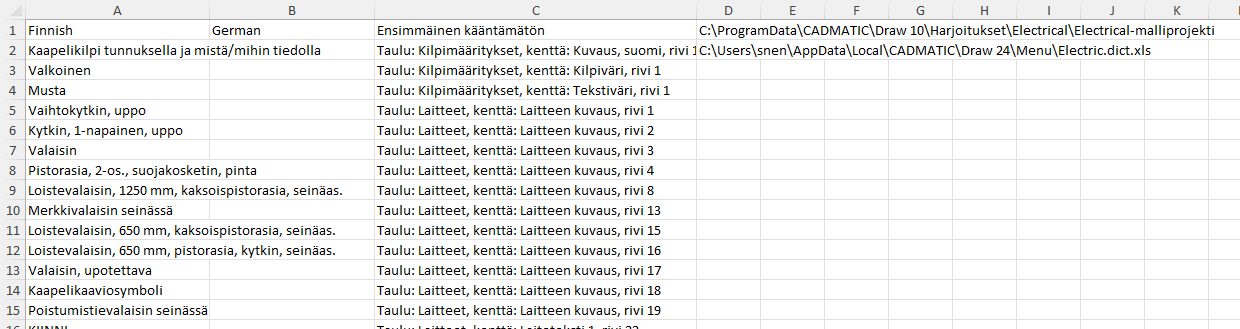 Toiminto käy läpi koko projektin ne taulukot ja kentät, jotka on määritetty käännettäviksi (EDBCommon.sqlite-/EDBCommon.mdb-projektin KaannettavatKentat-taulussa). Tekstit lisätään valittuun Excel-tiedostoon.