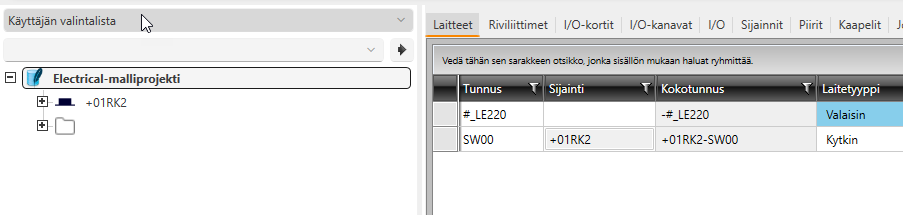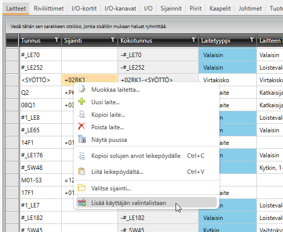 Jos haluat löytää projektitietokannasta tiettyjä laitteita tai muita tietoja nopeasti, voit lisätä ne omaan valintalistaasi.
