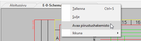 Avaa projektihakemisto näppäinyhdistelmällä Ctrl + E tai napsauttamalla dokumenttivälilehteä hiiren kakkospainikkeella ja valitsemalla Avaa piirustushakemisto: