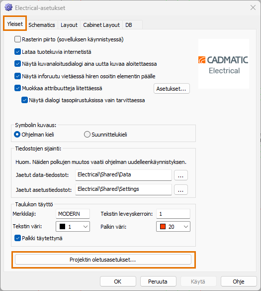 Valitse Electrical-välilehti > Asetukset-ryhmä > Electrical ja sitten Yleiset-välilehdeltä Projektin oletusasetukset.