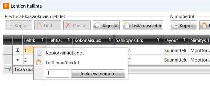 - Kopioi/Liitä – Kopioi lehti/lehdet leikepöydälle kaikkine tietoineen. Liitä-toiminto liittää lehdet alkuperäisillä lehtinumeroilla. Jos liitettävä lehtinumero on jo olemassa, lehti lisätään loppuun.