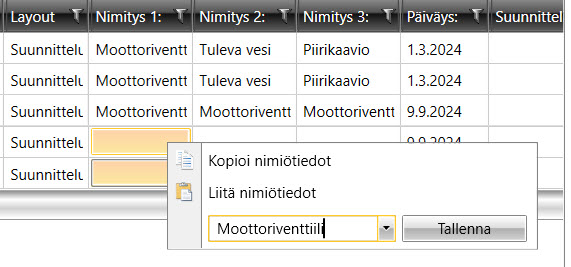 - Kopioi/Liitä – Kopioi valitun lehden nimiötiedot leikepöydälle. Liitä-toiminto liittää nimiötiedot valitulle lehdelle.
