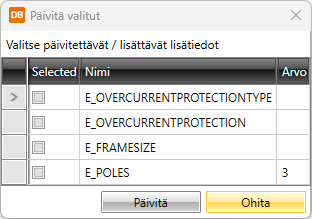 Valitse – Voit itse valita lisättävät/päivitettävät lisätiedot. Valittuasi symbolin avautuu Päivitä valitut -dialogi, josta voit valita haluamasi lisätiedot: