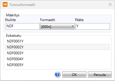 - Tunnusformaatti – Kenttä näyttää tunnusformaatin. Jos haluat määritellä uuden formaatin, napsauta