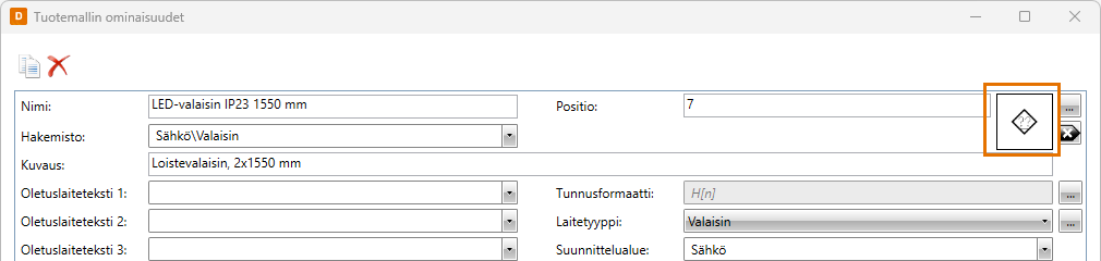 - Positio – Anna laitteen positionumero ja valitse positiomerkki positioitaville laitteille, kuten valaisimille ja lämmittimille.