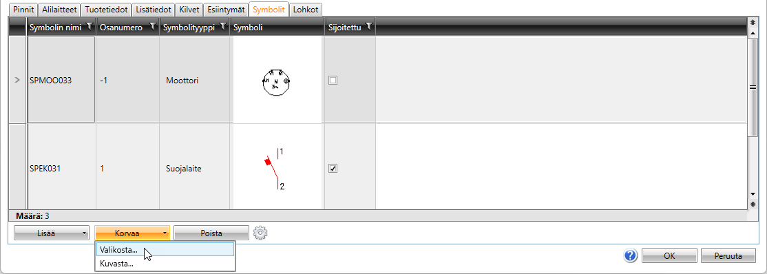 Voit lisätä, korvata ja poistaa tuotemalliin määritettyjä symboleita.